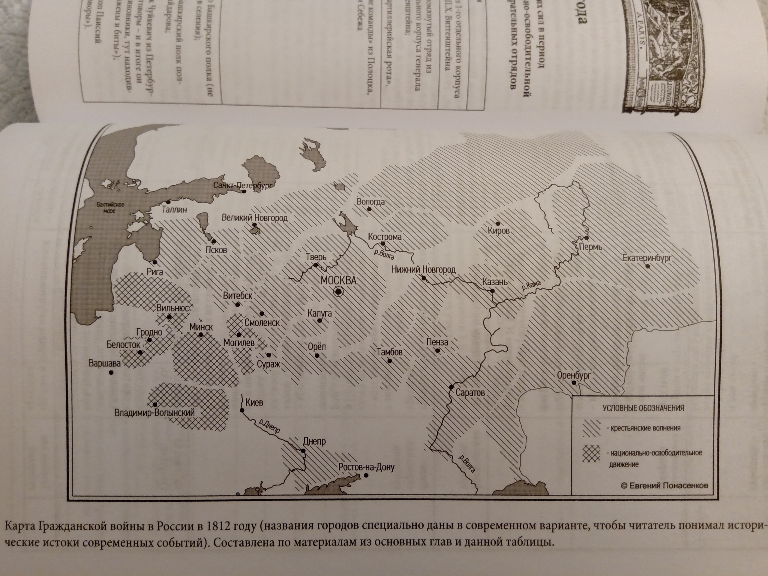 Понасенков доказывает, что для Русского Народа@tm лучше было дружить с Наполеоном, быстрее перенять его Кодекс, и воевать против Англии. Но когда этот народ спрашивали? К чести славян, народные восстания в 1812 происходили постоянно, Понасенков приводит их длинный список в таблице — и это тянет на гражданскую войну. Но Александр презирал своих крестьян-рабов и бросал их в топку войны против Наполеона, которую сам начал, и не собирался больше сдерживаться, объявляя всё новые рекрутские наборы (на 25 лет, лол). В итоге Наполеона таки закидали трупами (почему он не сжёг Лейпциг и Париж?), но получили застой, восстание декабристов, отставание от Европы, Первую Мировую (в которой частично виноват Николай II), крах империи, гражданскую войну с миллионными жертвами, большевиков, голодоморы, террор, Вторую Мировую (в которой частично виноват Сталин) и 95 миллионов жертв коммунизма по всему миру.