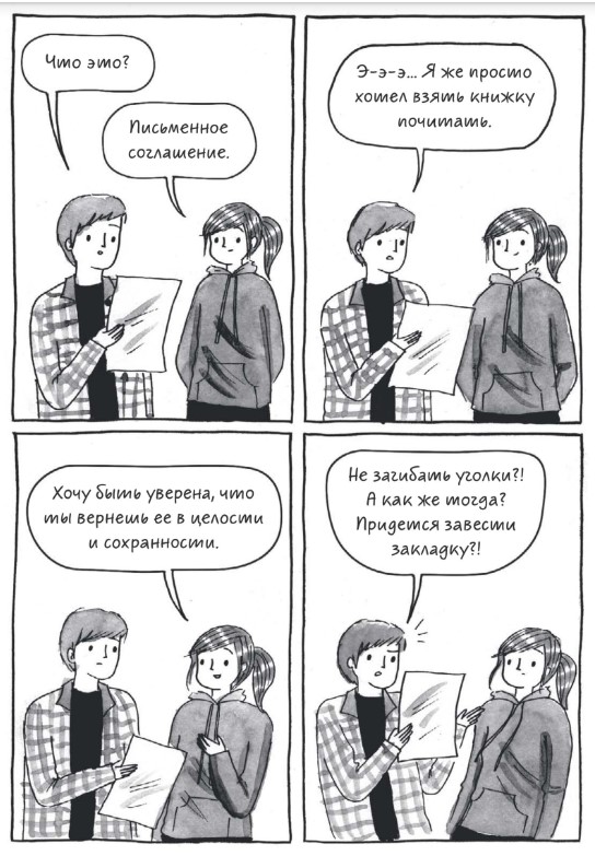 Комикс представляет собой зарисовки из жизни тех, кто любит читать - подходят они и тем, кто читает в бумаге, и тем, у кого глаза выдерживают только электронку - практическ на каждой картинке узнаешь себя.
