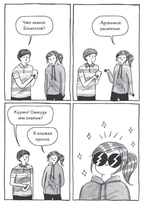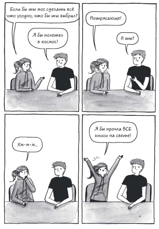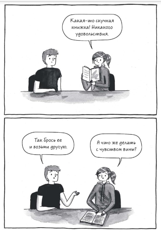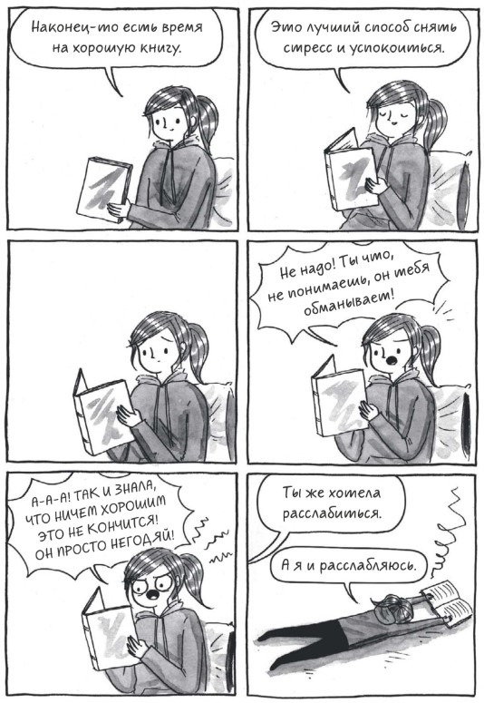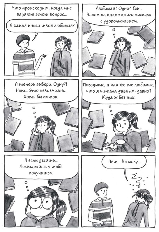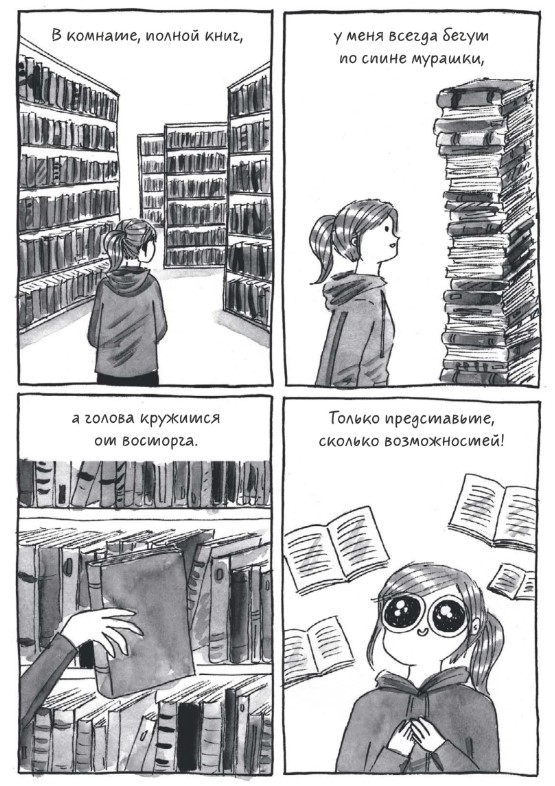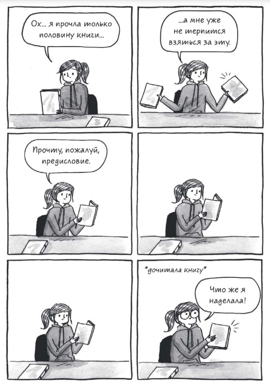 Конечно же, во многих кадрах узнаешь себя, даже не смотря на то что я из лагеря электронных книг, а героиня комикса из лагеря бумажных. Я читаю бумажные книги очень редко, для меня они физически неудобны, но многое пересекается просто на уровне постоянного безостановочного чтения, просмотра околокнижных лекций и интервью, похода по библиотекам и магазинам. Хотя, я читаю электронные книги с телефона, поэтому окружающие не знают, по большей части, что я читаю, а не залипаю в интернете. Так что для меня этот комикс не только повторное переживание собственных моментов, но и новый опыт, опыт чтения бумажных книг.