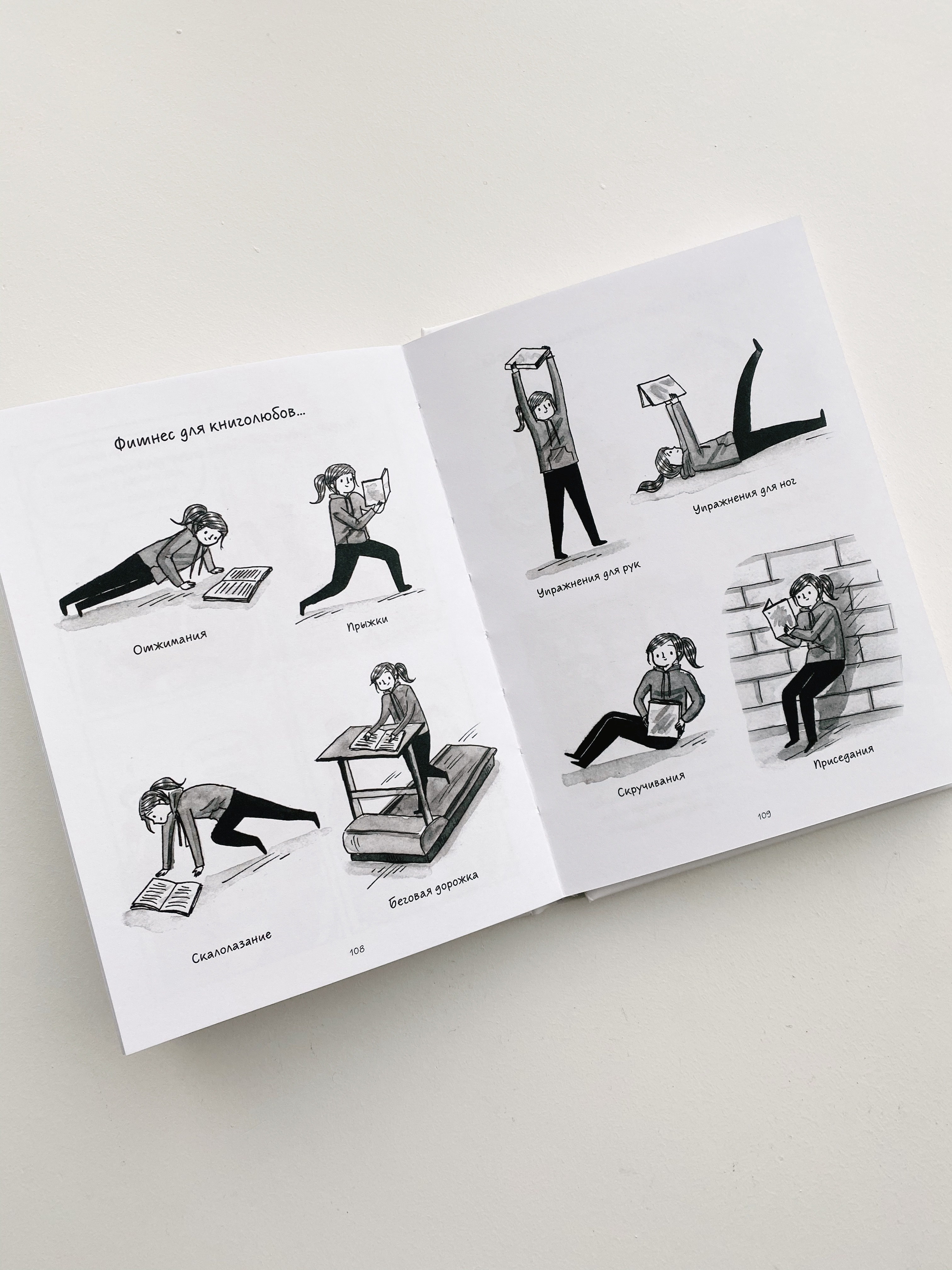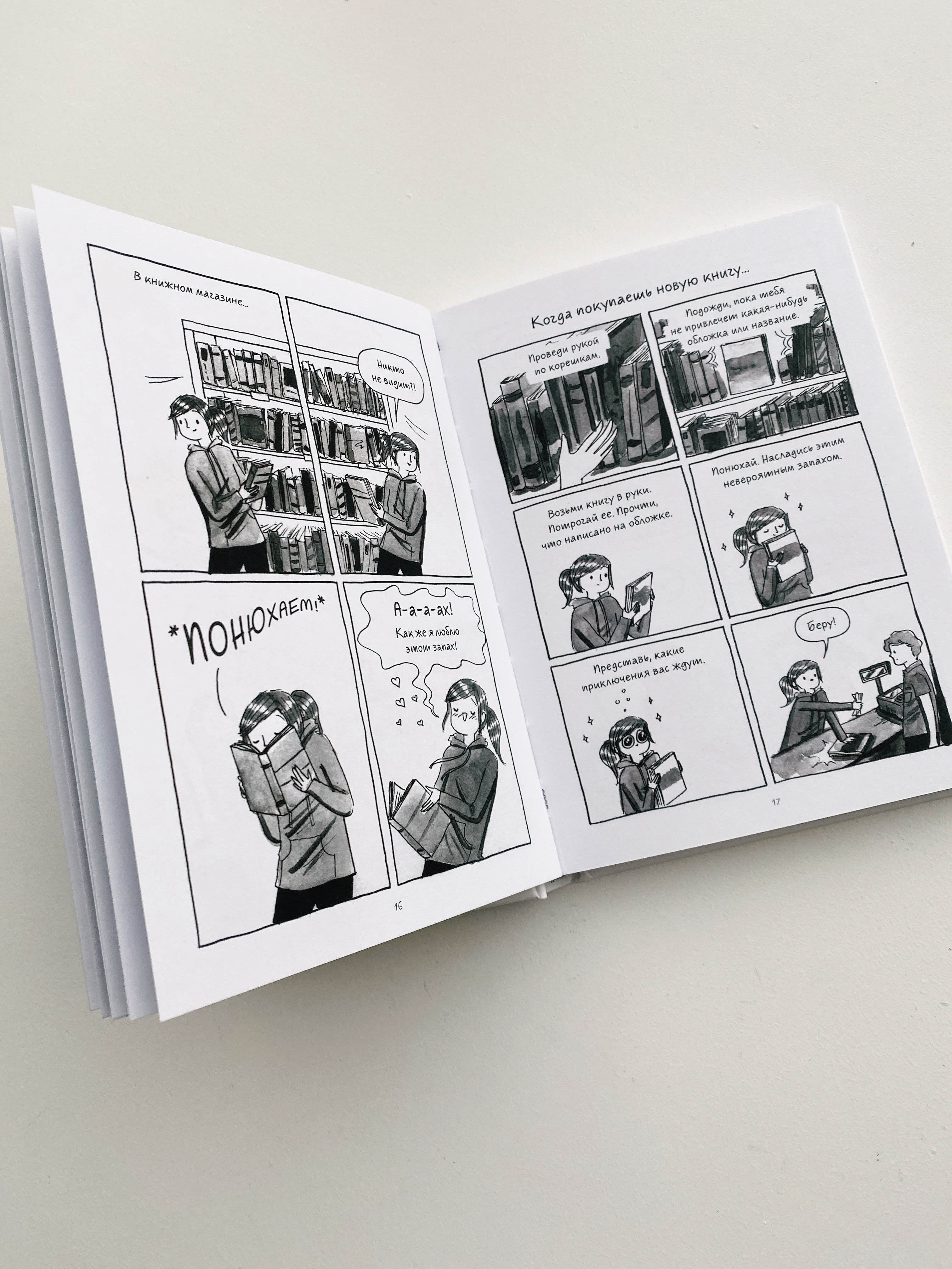 И много-много-много ситуаций, в которых вы узнаете себя, если вы настоящий любитель книг Я в восторге от этой малютки и точно буду ее еще ни раз листать и улыбаться - она дарит отличное настроение Как и рисовка - сразу представляешь себя на месте героини и не важно, что другие могут тебя не понять