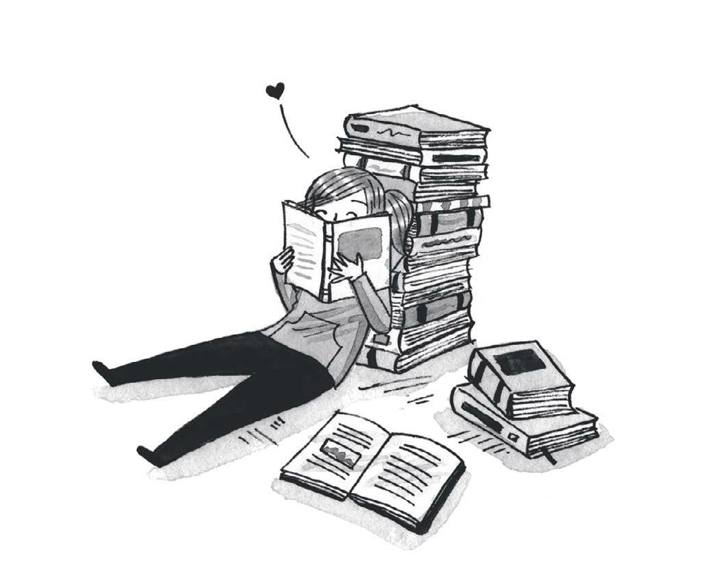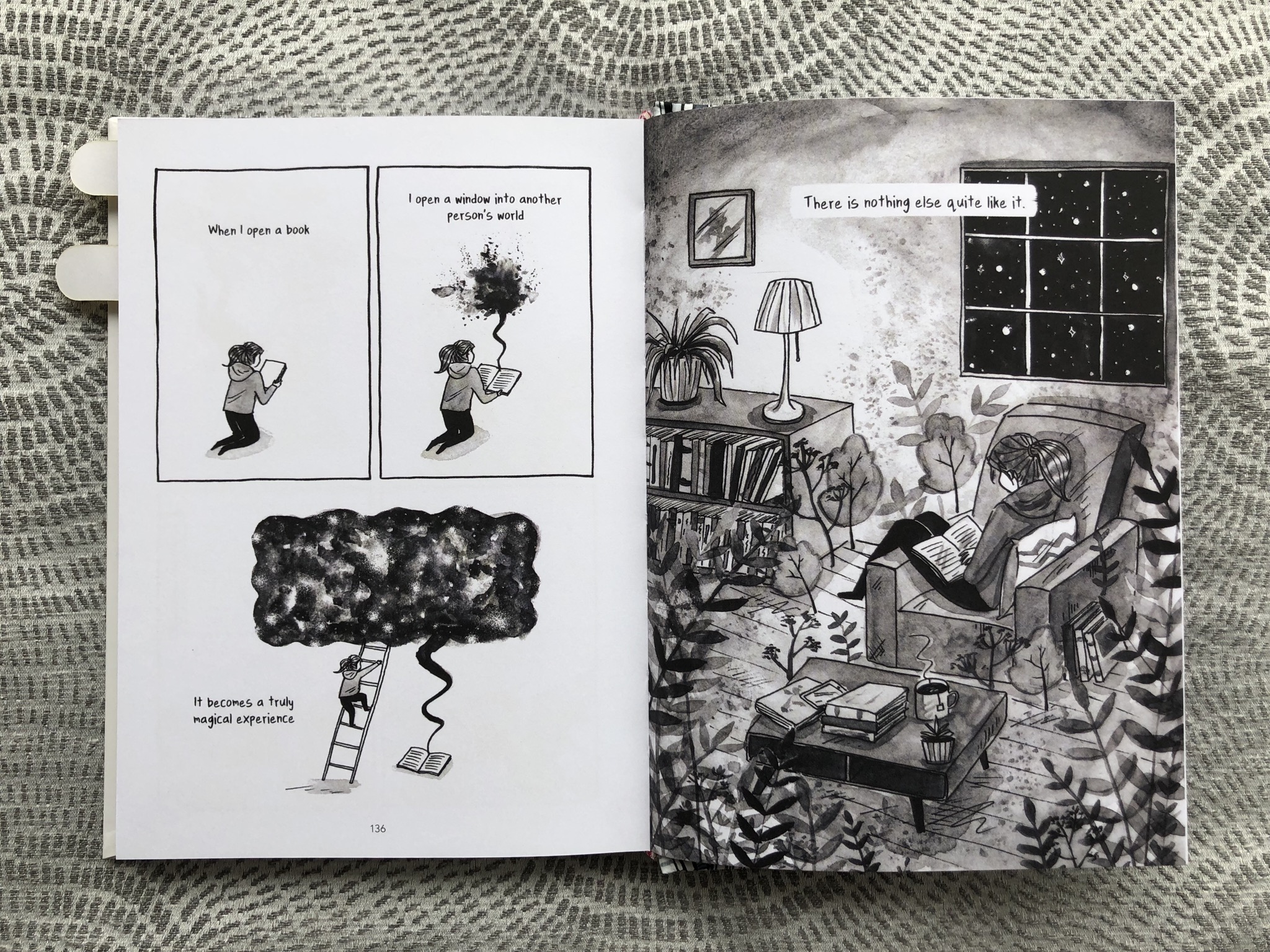 Автор подмечает мелочи и показывает это в достаточно милом ключе - как можно читать ночь на пролет, отказаться ехать куда-то без книги в дорогу, как можно бесконечно долго гулять по книжному, выбирая то, что захочется прочесть, и в итоге купить вместо одной книжки целую стопку. У героини комикса есть молодой человек, поддерживающий ее увлечения, и это выглядит очень органично, хотя в жизни иногда нечитающему человеку сложно понять увлеченного чтением.