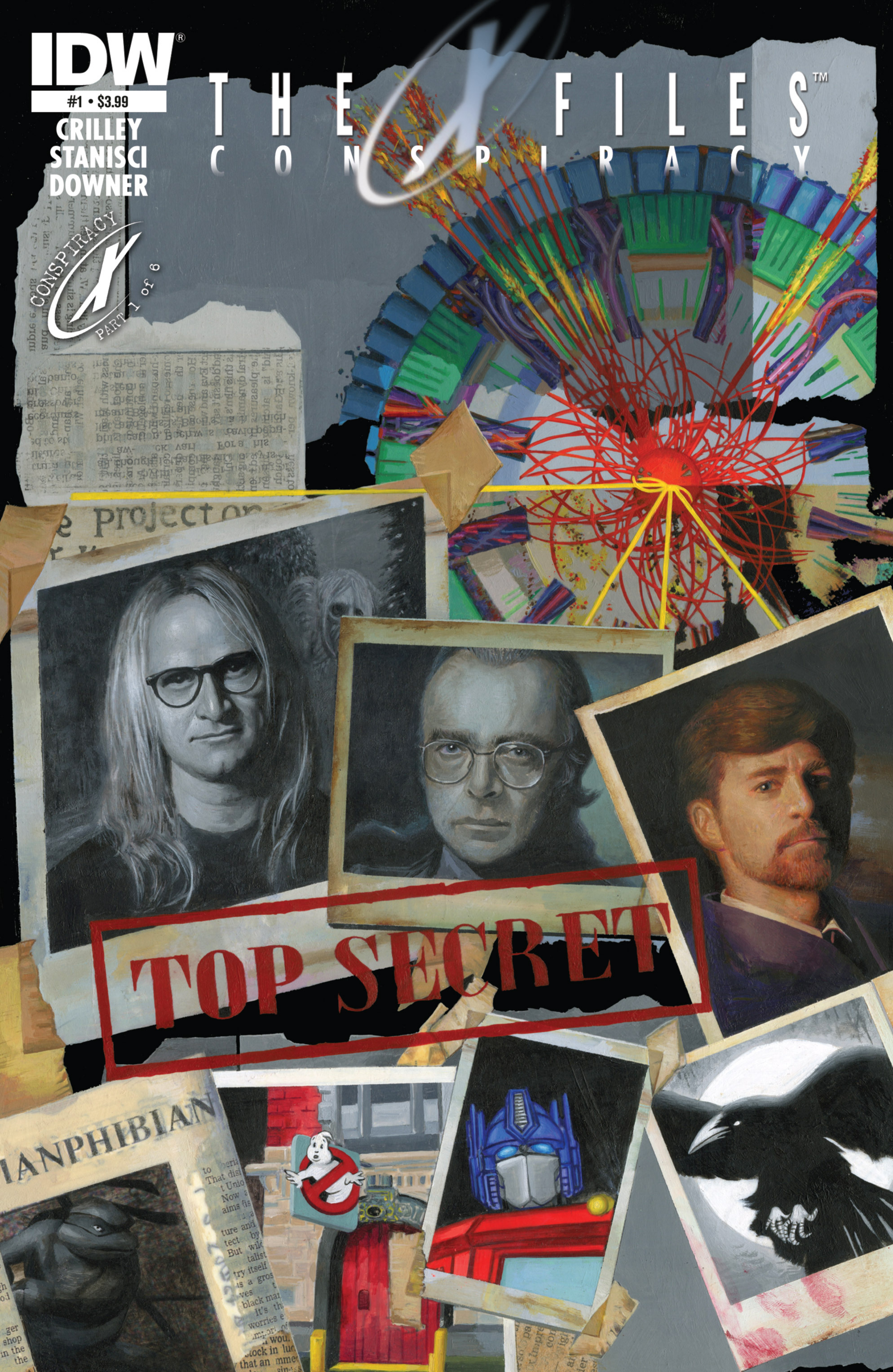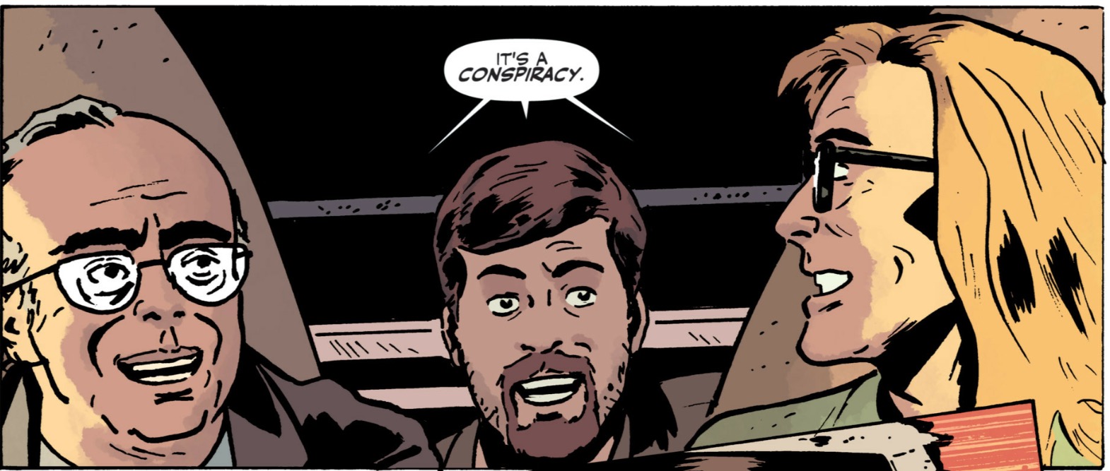 И вот тут градус абсурда несколько пробил крышу. Дело в том, что "Заговор" — это кроссовер "Секретных материалов" с другими попкультурно-комиксовыми франшизами: "Охотниками за привидениями", "Черепашками-ниндзя", "Трансформерами" и, внезапно, "Вороном" (да, про которого был фильм с Брендоном Ли). Встрече и взаимодействию с героями каждой франшизы отводится один номер. Но что общего у всех этих историй, спросите вы? Мне трудно объяснить словами, но я попробую.