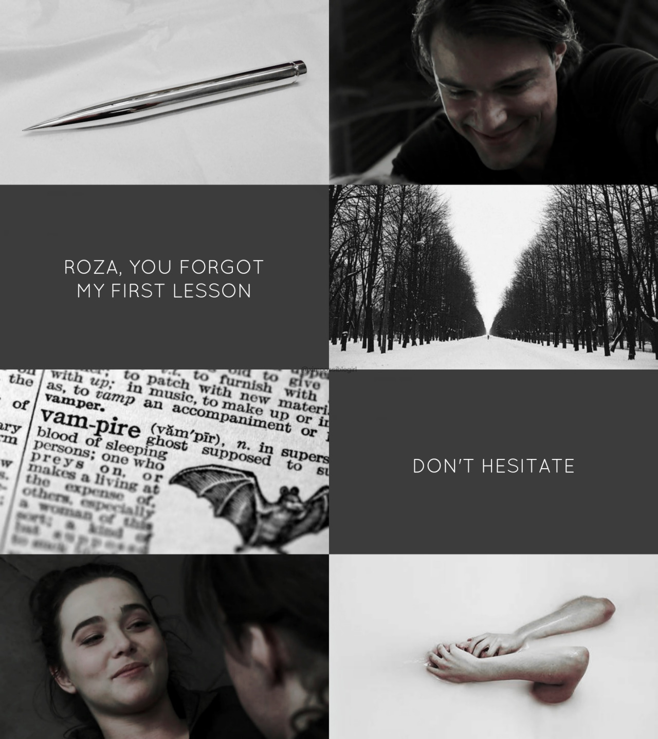 Когда она наконец-то встречает Дмитрия,все идет не так,как она планировала. Он "вырубает" ее и приносит в особняк,который просто кишит стригоями. Дмитрий вроде бы обходится с ней нежно,но монстр внутри него иногда берет верх. Сначала, Роза пробовала бороться,но потом идея стать стригоем уже не казалась ей такой устрашающей.