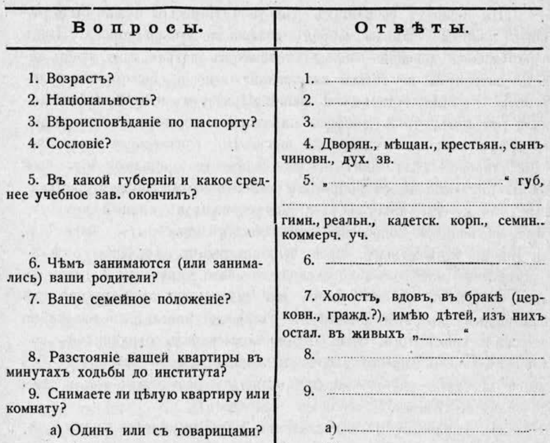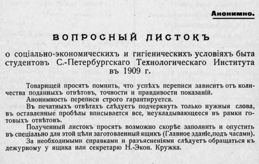В ноябре 1909 года в Санкт-Петербургском Технологическом институте по инициативе Научно - экономического кружка проходило анкетирование студентов. Не будем долго растекаться мыслью по древу, а лишь кратко расскажем о технической стороне опроса, чтобы затем познакомить читателя с результатами анкетирования.