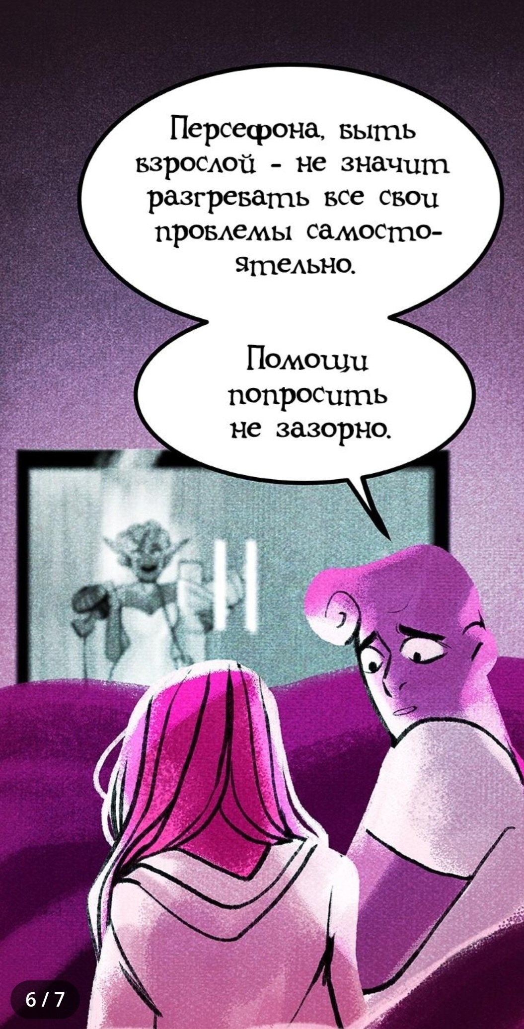 AnastasiyaKriva7 января 2026 г.Прочитала за день первые три части. Какие же красивые картинки, просто нет слов:> Очень милая история. Конечно, многое притянуто за уши, и в начале первой части я даже не понимала, что читаю, но потом втянулась, и чтение стало таким приятным и лёгким. Очень милая, воздушная история. И, конечно, мне очень нравится, что всё основано на греческой мифологии. Если думаете, стоит ли читать, то ради этой красивой рисовки хотя бы, однозначно ДА!Читать далее