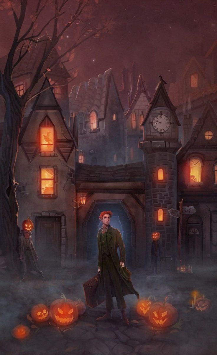 Читать далееЗнаете, есть такие огромные детализированные картины, на которых происходит всё и сразу? Такие, на которые смотришь и в каждом сантиметре полотна разворачивается действие. Вот и эта книга напоминает мне такую картину города, где, если присмотреться, каждый персонаж занят своим загадочным занятием. Вон в левом верхнем углу какая-то ведьма в тумане расставляет вокруг города огромные тыквоголовые пугала. Чуть правее и ниже начинаются редкие домишки и среди них плутает рыжеволосый парень в зеленом костюме, ищущий дом, которого нет. Вон ближе к центру мальчишка в одних лишь пижаме и пальто спешит за неясной фигурой в красном берете. Всю правую часть такой картины занял бы большой мрачный особняк, вокруг которого были бы припаркованы ретромобили и суетились эксцентричные люди с огромными чемоданами. В окно посторонний наблюдатель смог бы увидеть клубы пара с кухни, где три ведьмы готовят в котлах праздничный ужин. По коридору крадется жуткая размытая тень, из камина выходит новоприбывший гость, тыквы на столах и на полу провожают какую-то девушку взглядом, а на крыше в рядок припаркованы метлы.