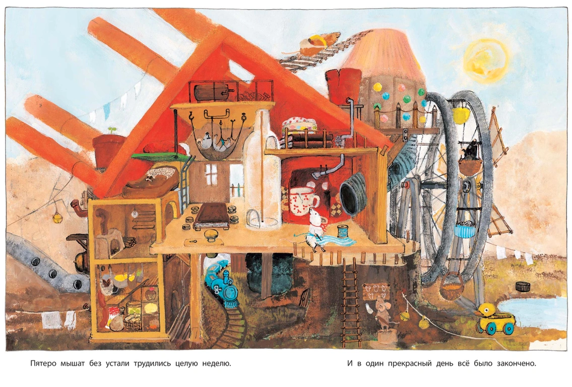 Книжка-картинка японской художницы Чисато Таширо – это тоже своеобразная книжка-игра по строительству самого лучшего на свете дома. Пятеро мышат ищут жилище и решают построить его самостоятельно, выбрав для этой цели чудесную кучу мусора. Работа закипела! Читать о мышиной «стройке века» очень интересно и очень смешно. Чего только ни притащили мышата в качестве подсобного материала: креативщиков видно сразу! Цветочный горшок подошел для слива дождевой воды, из сломанных часов получилась уютная кухня, стеклянные шарики украсили комнату отдыха, а во дворе разместился прекрасный парк развлечений из старых шин. А кто же будет охранять дом? Настоящий сторожевой кот! Теперь мышата могут жить себе поживать, да добра наживать!