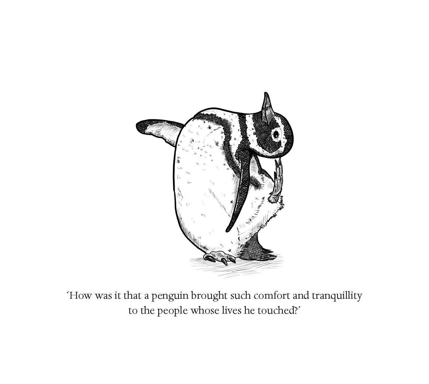 Вот так выглядит обложка прочитанной мною книги.Там также есть ряд иллюстраций внутри книги, таких, как эта. На ней Хуан Салвадо чистит перья на голове. (Из книги деНаполи я узнала, что более крупные виды пингвинов делают это концом крыла.) Фраза под рисунком означает: «Как так получилось, что пингвин принёс такой комфорт и спокойствие людям, чьих жизней он коснулся?»