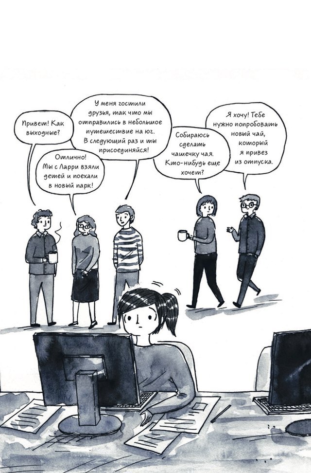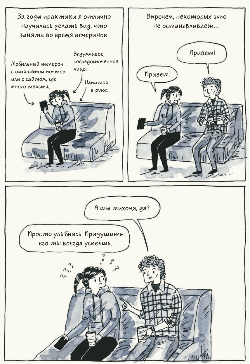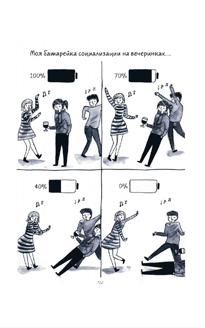 Терапевтический эффект оказывают не только общность опыта и взаимопонимание. Не менее приятно знать, что при всех проблемах (возникающих из-за того, что лишь экстраверты в современном обществе считаются априори нормальными и успешными) интроверт таки может жить счастливо, завести семью, найти работу по душе, — как это сделала Дебби-героиня. Конечно, она наверняка упростила собственную историю для комикса, но всё равно хочется верить, что в ключевых деталях она не соврала — и всё так и было.Что меня всегда поражает в книгах про интровертов, так это как?! ну как авторы это делают?! Как сценки из жизни любого автора-интроверта могут быть настолько похожи на сценки из моей собственной жизни? Даже Дебби в одном из комиксов сказала аналогичную фразу, начитавшись интровертов-блогеров: «Это как будто про меня написано!» Но чтобы вы действительно захотели прочитать эту книгу, нужно меньше слов и больше картинок! Поделюсь любимыми (прям от сердца отрываю).