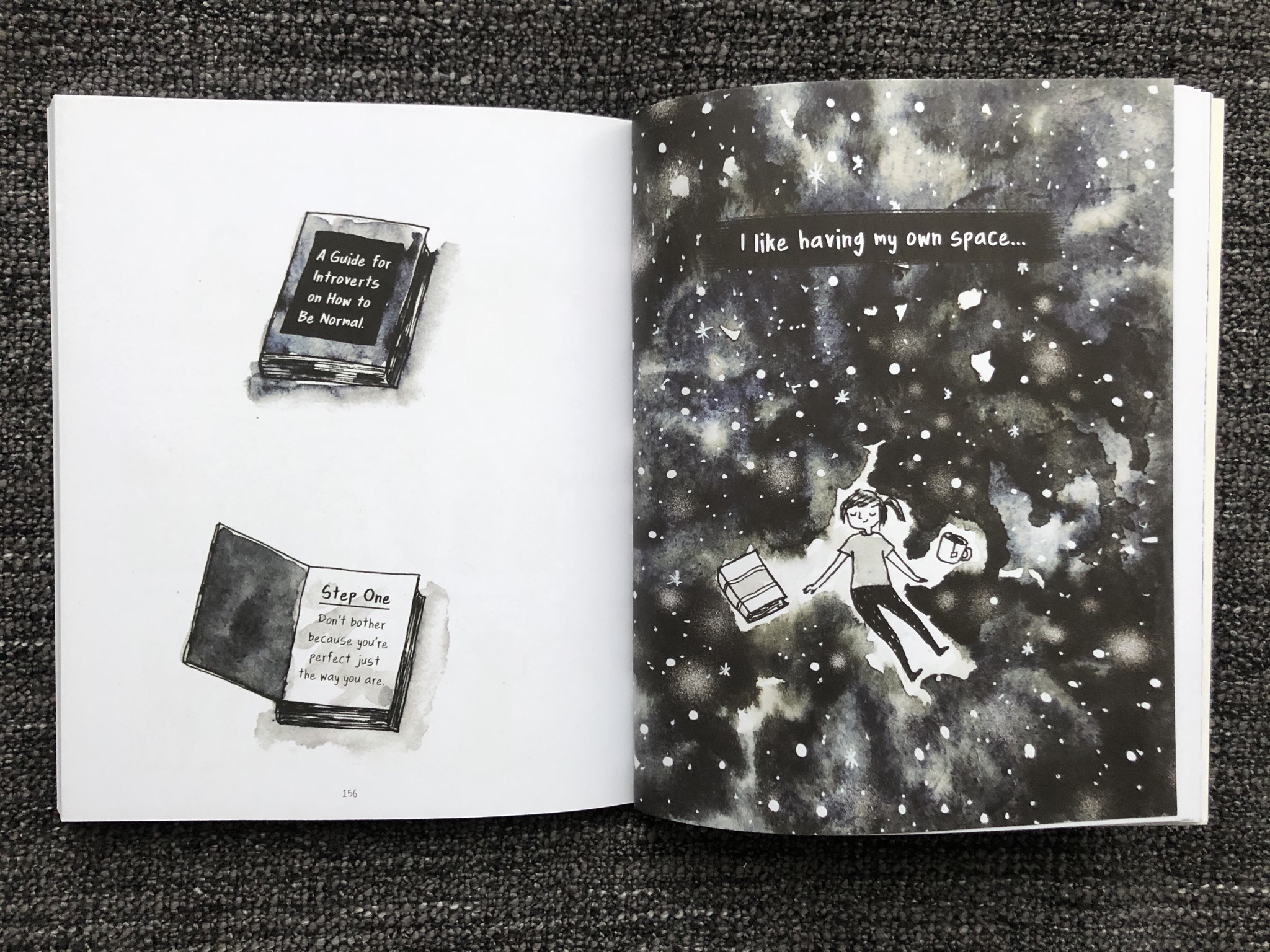 Поэтому комикс я бы в первую очередь посоветовала бы особо упертым экстравертам, может они хоть немного нас поймут, перестанут лезть с вопросами "Ты чего такая грустная/серьезная/молчаливая" и начнут уважать личное пространство других людей (экстраверты, не обижайтесь, я далеко не про всех конечно же). Но и интровертам книжка тоже будет приятна и полезна, над какими-то стрипами можно в голос посмеяться, над какими-то повздыхать, а что-то может и заставит задуматься и сказать самому себя - нет, мне не стыдно, что у меня мало друзей, зато они все настоящие. Мне не стыдно, что вместо ночного клуба, куда меня позвали, я сижу дома с книжкой. Мне не стыдно быть собой, ведь я никому не причиняю зла, просто я такой.