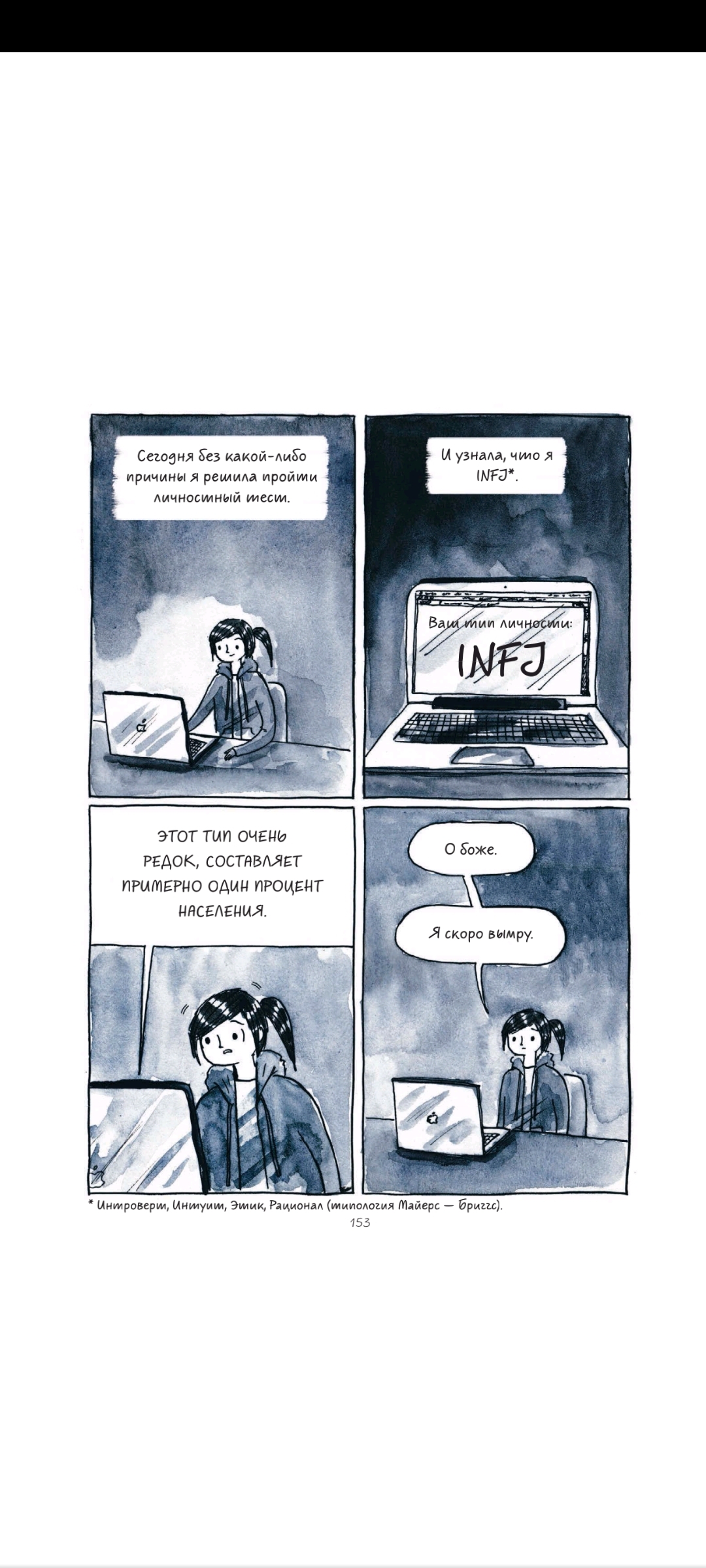 В целом мне понравилась эта книга, многие моменты оказались близкими и родными, сама я, как и автор являюсь интровертом. Над кое-какими вещами было приятно посмеяться или просто улыбнуться, художница не лишена юмора, а что-то и вовсе показалось практически нереальным, так это было похоже на мои моменты из жизни, даже поражает, как часто люди повторяют друг за другом, приходя к тем или иным одинаковым решениям и переживаниям.
