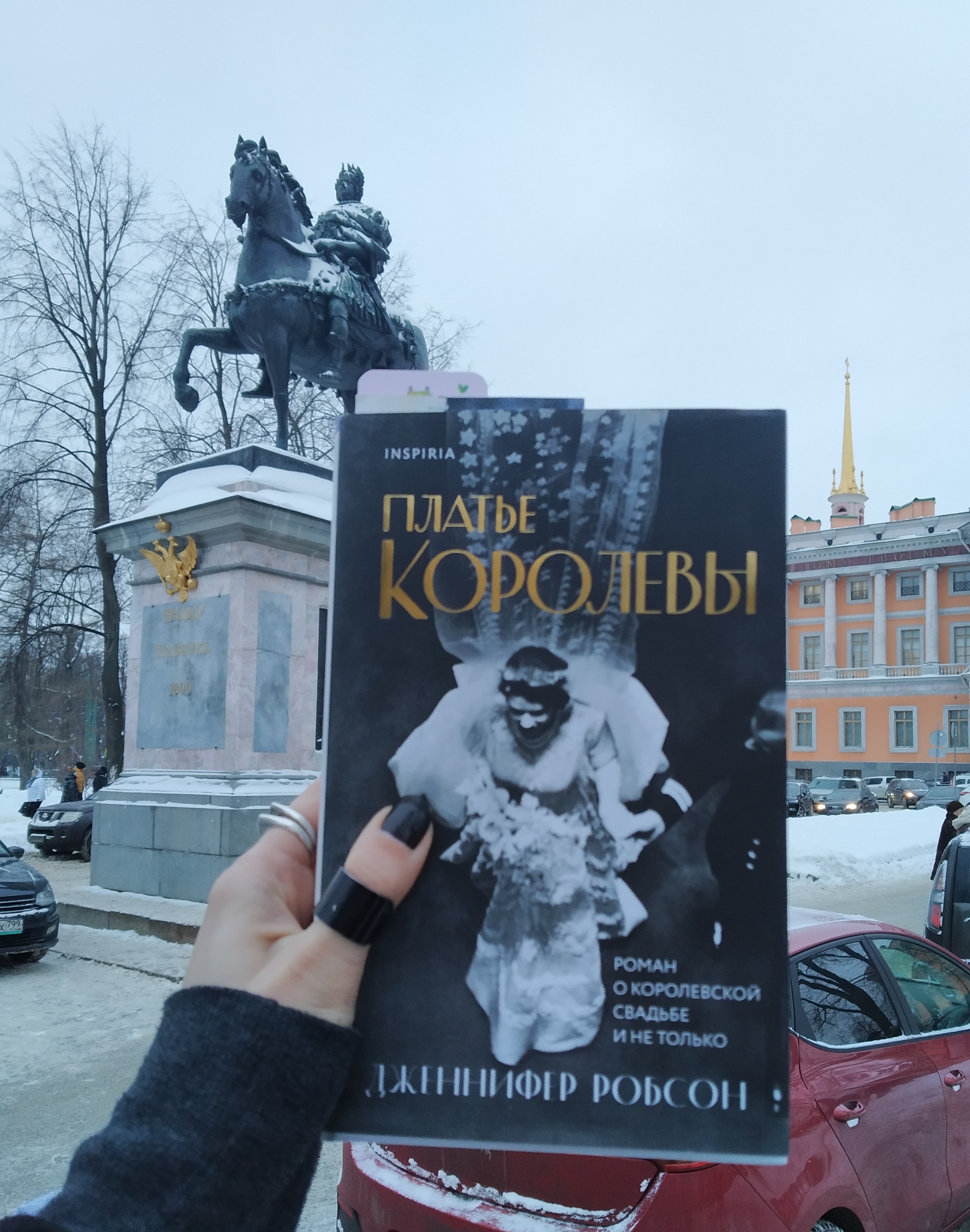 Действия происходят и в Англии второй половины 40-х гг прошлого века, и в современном Лондоне, а также в Торонто. А ещё книгу очень приятно взять в руки: белая обложка с тиснеными цветами (будто вышивкой), хорошая полиграфия, а на суперобложке фото со свадьбы Елизаветы.