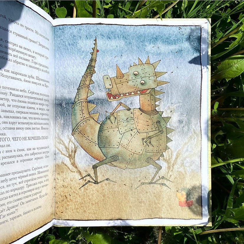Сюжет и правда необычный, у ежонка-трусишки злобный дракон утащил маму и малыш отправляется на её поиски. Пока неплохо (разве что здорово смущает момент с интернатами и закон здорово ущемляющий права колючих жителей леса), но кто ему встречается? Сплошные страшилки. Просто рассадник будущих ночных кошмаров. Есть и добрые персонажи-помощники, но они, кроме ослика пожалуй, скучные. А выверты со временем? Ребенку сложно будет понять что к чему.