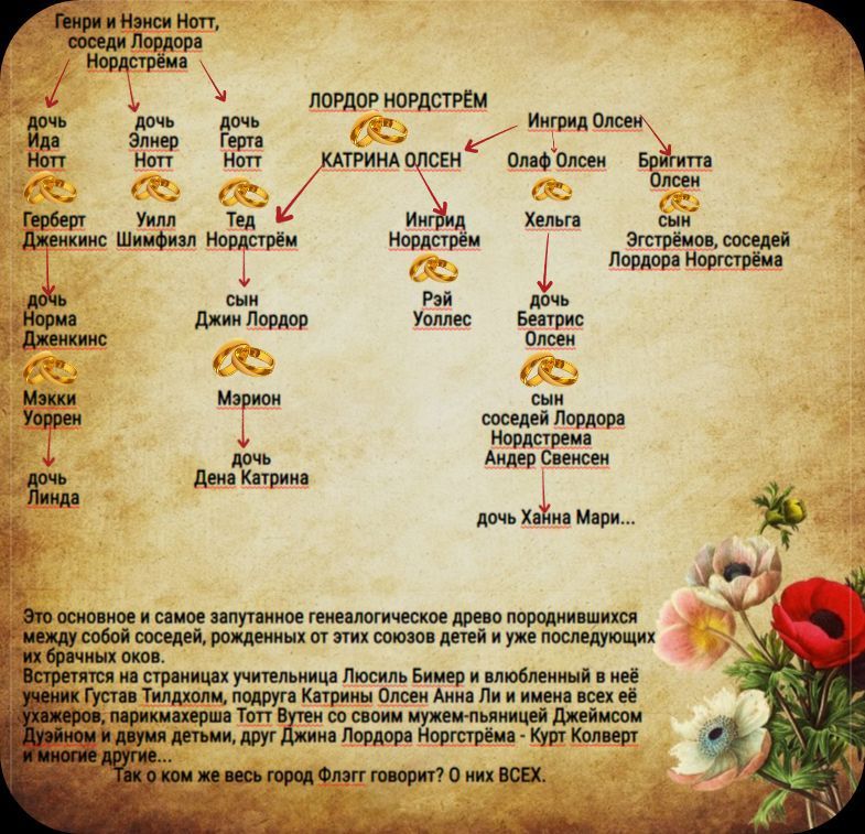 История милая, со смыслом, и всё же это не совсем то, чего я ждала, вряд ли к ней вернусь.P.S. Возможно кому-то пригодятся собранные мной родственные и семейные связи задействованных в книге основных персонажей. Кто не хочет знать, о чем говорит первая половина книги, не смотрите картинку ниже.