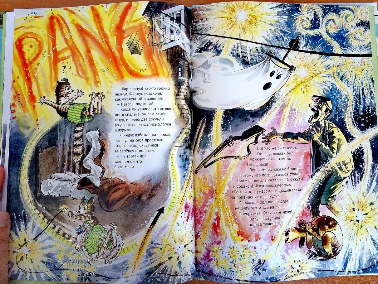 Ну и, конечно, Нурдквист-художник всегда радует, в этом плане каждой его книге ставлю высший балл. Вон фейерверк на картинке выше - чем не Ван Гог, а? А еще здорово долго-долго выискивать-рассматривать многочисленные детальки.ЗЫ. Единственное, что совсем не радует - так это цены на книги серии от издательства "Белая ворона". Первые книги о дедуле Петсоне и его котенке я покупала на русском языке, и они стоили в Украине 80 грн, что и тогда было недешево (для сравнения - за эту же сумму примерно в то же время мной была приобретена большая книга стихов Барто). А нынче стоимость вообще космическая - в районе 180 грн. Зато на сайте Богдан-книги "Петcон и Финдус" на украинском языке стоят по 35 (!) грн за книгу. Заказала 5 книг, которых у меня не было. С доставкой вышли как раз те же самые 180 грн, что просят за одно беловоронское издание. Почувствуйте разницу, как говорится. Качество идентичное, кстати. Так что рекомендую жителям Украины, которых не смущает укр. яз. Жаль только, что это остатки от изданий 2012 года, а новых книг серии "Богдан-книга" не издает (ну и если вдруг - то стоить, очевидно, они уже будут дороже).