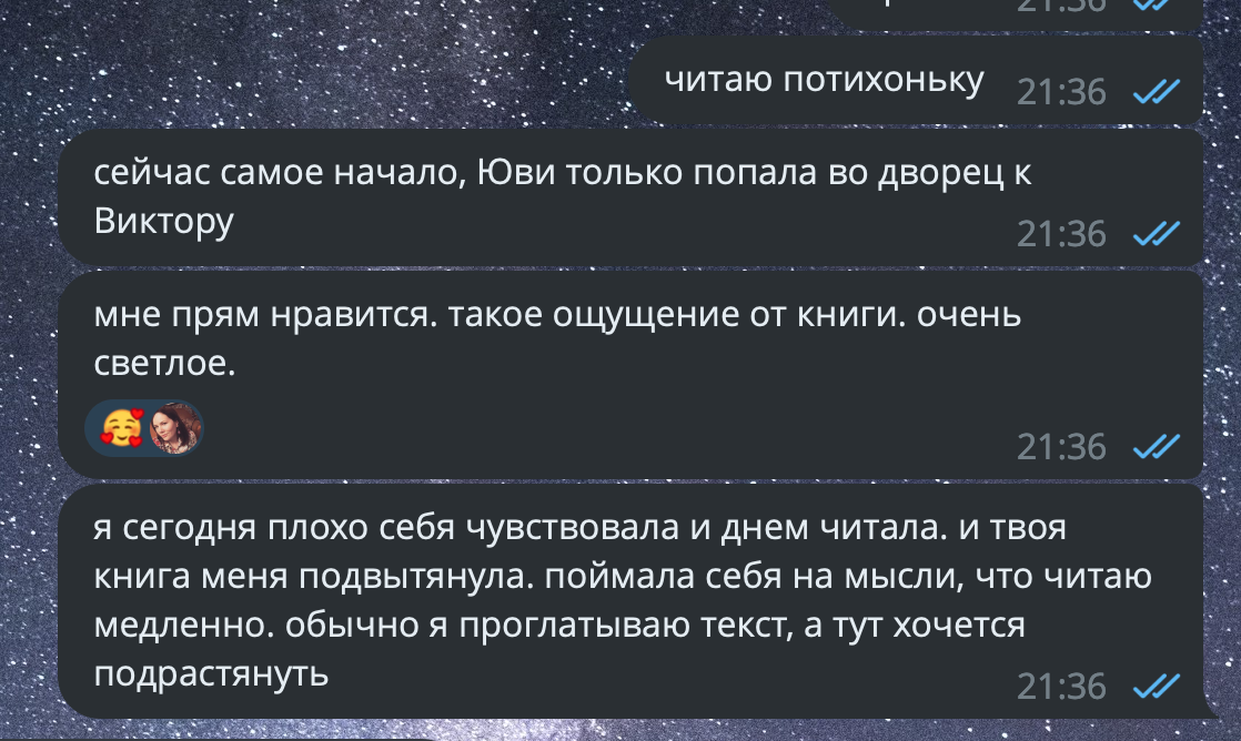 У книги так же явно должно быть продолжение. При этом историю Юви и Виктора закончена, но в продолжении будет уже рассказана история других персонажей, и нам это дают понять в последних абзацах. И я буду с нетерпением ждать продолжение, потому что у меня теперь небольшой кредит доверия к автора после такой прекрасной работы.11 понравилось
