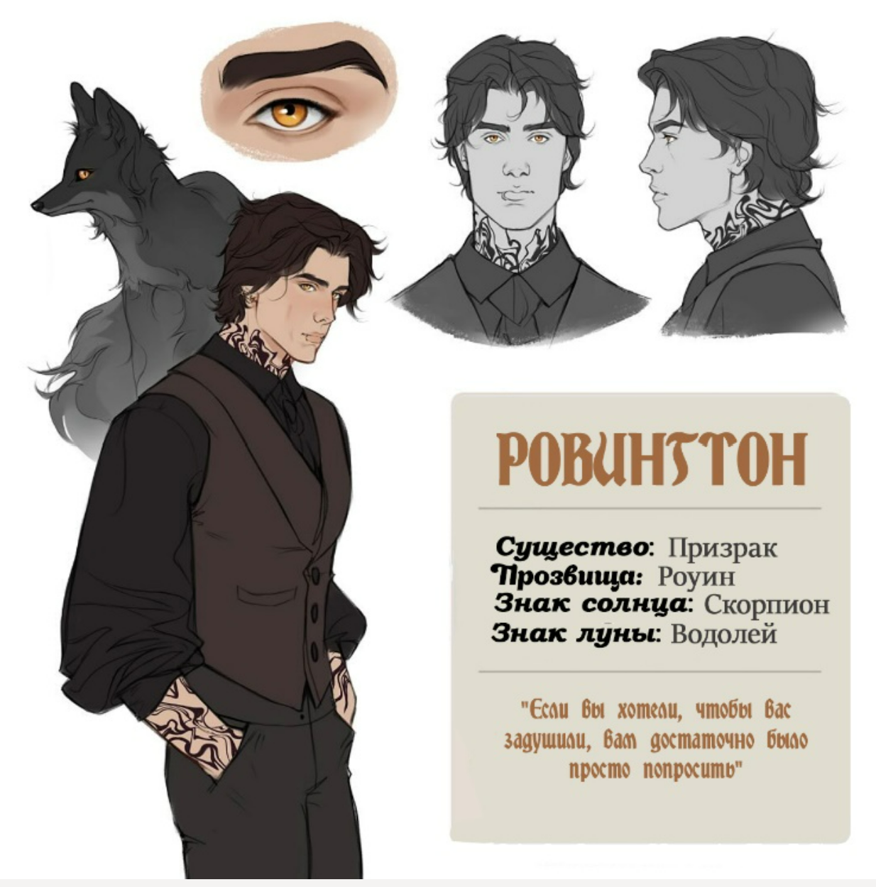 Он - Роуингтон Сильвер - Роуин. Создание Ада, вечный с темной магией и фамильяром - лисой. Мрачен. Не многословен. Больше о деле, даже если на первый взгляд не о надежности и доверии... После безуспешных попыток избавится от гг и не впускать в дом, ввел в игру нового игрока... для него она «беда моя» и «ты моя любимая, чёртова, вкусная зависимость». Обменял свою вечность на ее воспоминания у короля дьяволов: «Вечность...за один единственный смертный миг».
