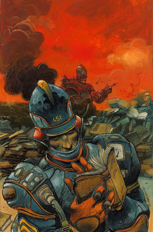 Итак, эта антиутопия рассказывает нам об обществе, где, среди прочего, особенно запрещены книги, и, как следствие, запрещена умственная деятельность. Главный герой по профессии как раз такой человек, который эти книги уничтожает. Но, и он оказывается не без греха.
