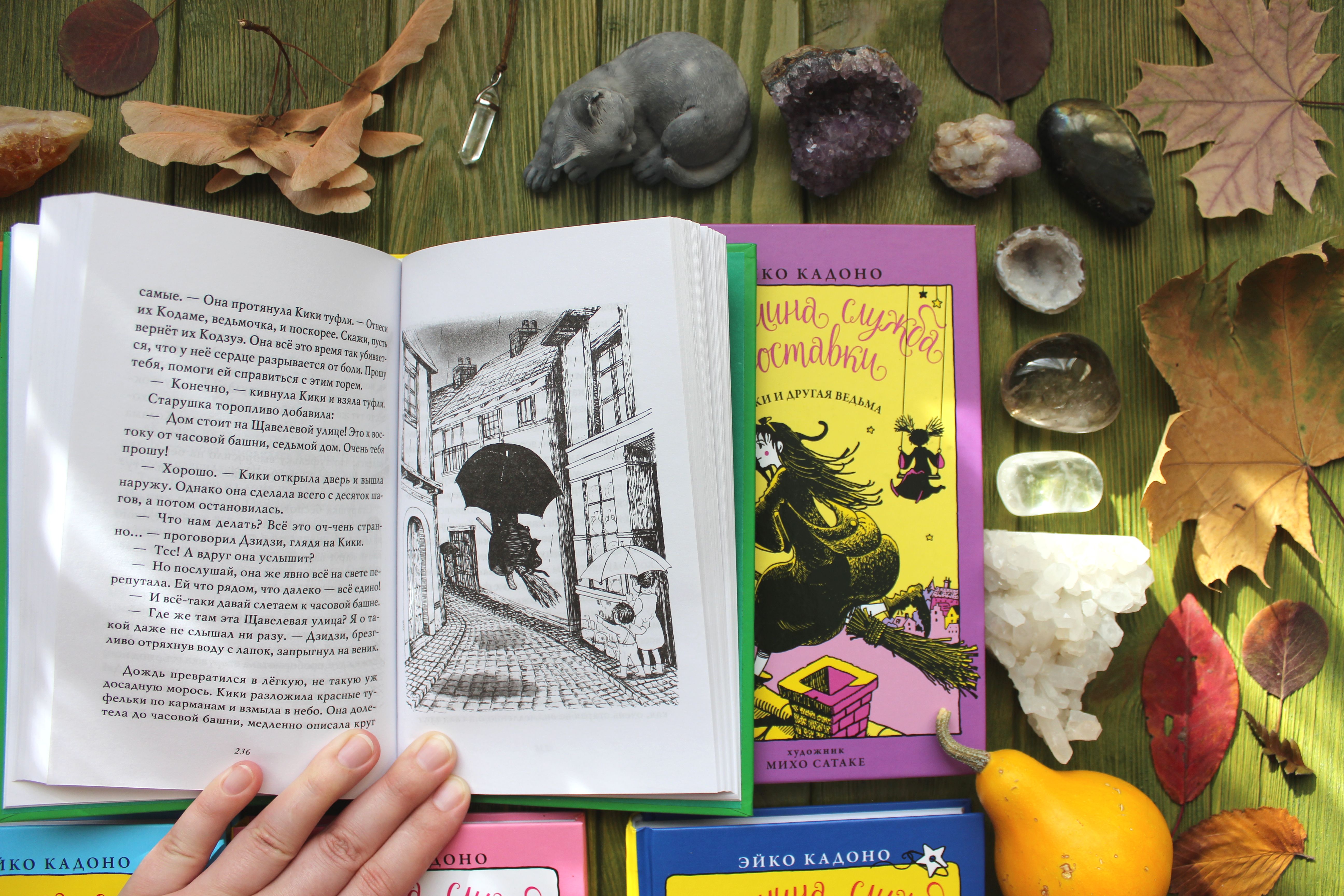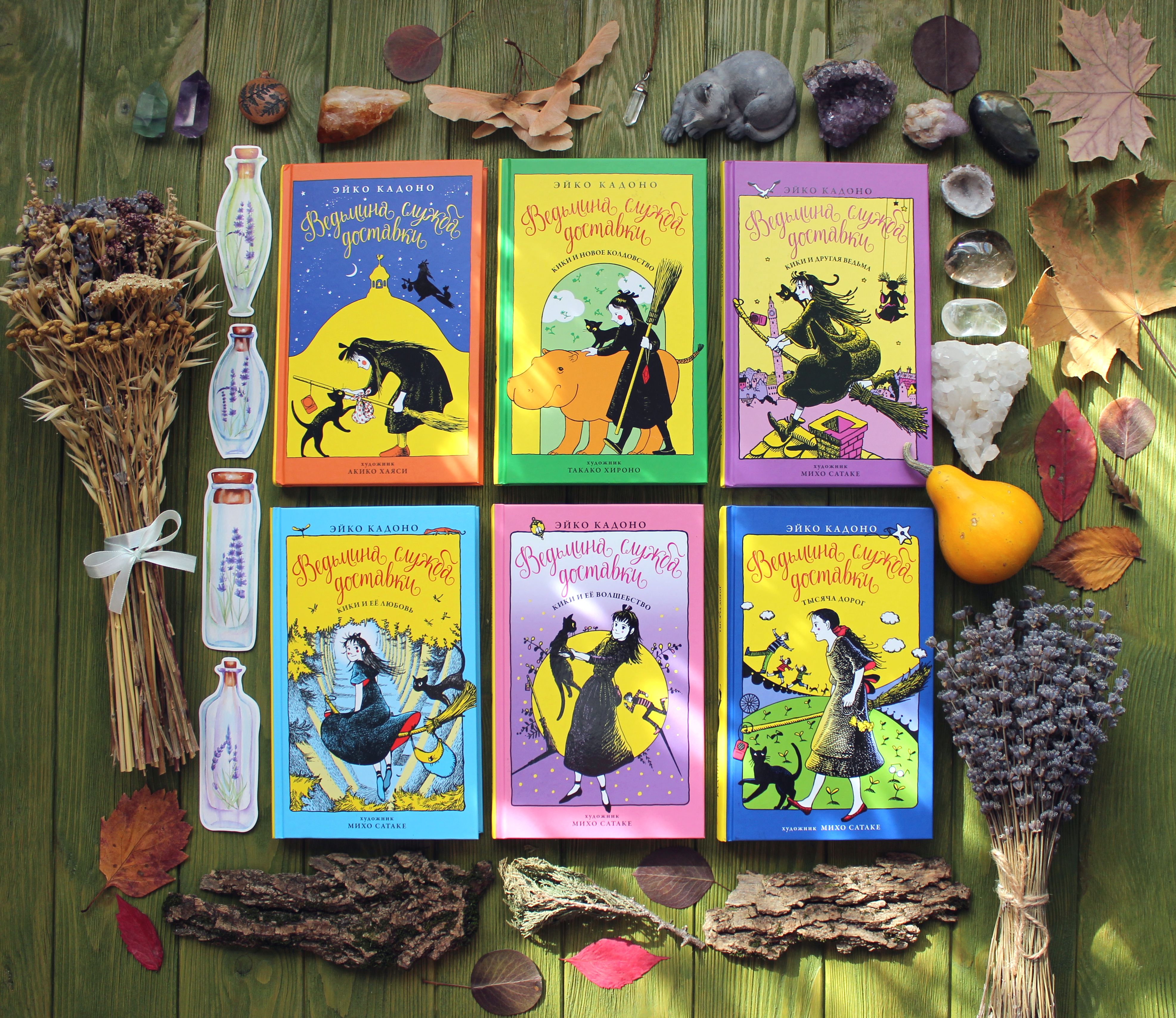Читать далееВы смотрели аниме «Ведьмина служба доставки»? Это полнометражный аниме-фильм режиссёра Хаяо Миядзаки, выпущенный в 1989 году студией «Гибли». Для меня это одна из самых любимых историй и всегда было интересно узнать, что приключилось с ведьмочкой Кики, её котом и их друзьями после событий, показанных в мультфильме. Узнать больше об этом красивом и уютном приморском городке, о его жителях. Поэтому, когда я обнаружила что у Кики есть книжный прототип, я с нетерпением ждала выхода книг Эйко Кадоно «Ведьмина служба доставки» на русском языке. И вот, наконец, осенью 2020 года я приобрела все шесть частей этой сказочной истории! Очень радовалась, получив свои экземпляры. Вы только посмотрите, какие они симпатичные! Что-то по-детски счастливое просыпается в душе, глядя на яркие обложки. Конечно, Кики на книжных иллюстрациях совсем не похожа на ведьмочку из мультика, но ведь и аниме появилось уже после выхода первых рассказов о Кики в далёком 1985 году.