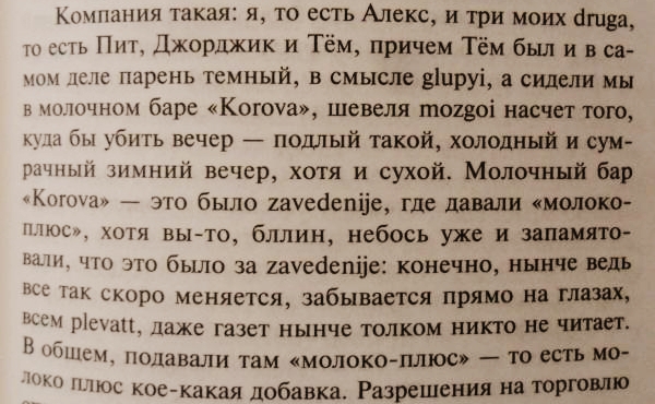 Так же отмечу, что книга написана в интересном стиле: сленговые слова написаны латиницей (moloko, grabli, pitt). Хоть и транслит иногда получается немного кривоват, понять его все же можно.