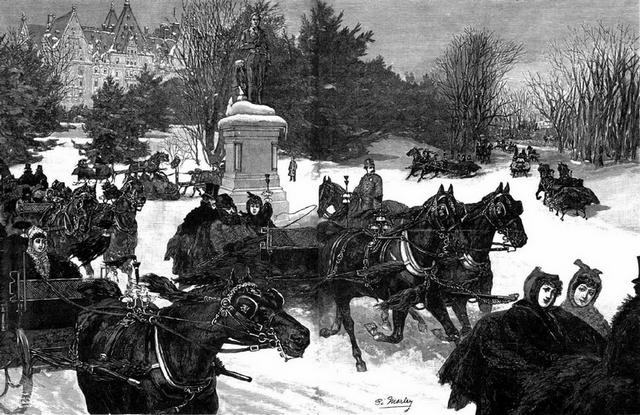 А какой шикарный зимний Нью-Йорк, я как будто видела его по-настоящему!Под зимними деревьями, под еще не потушенными газовыми фонарями собралось бесчисленное множество детей. Они были в странных, непривычных для меня зимних одеждах, но это были дети, они бегали, падали, кидались снежками, таскали друг друга на санках, с разбегу кидались на них животом. По аллеям ходили няньки, одетые словно сестры милосердия, толкая перед собой коляски на высоких колесах с деревянными спицами. А взрослые — взрослые прогуливались, просто прогуливались по скверу, по снегу, по морозу, будто пребывание на свежем воздухе было для них развлечением само по себе. Лаяли, бегали, прыгали, кувыркались собаки. И вокруг бурлящего сквера, наполненного жизнью и движением, невиданным парадом катились экипажи всевозможных расцветок и форм.