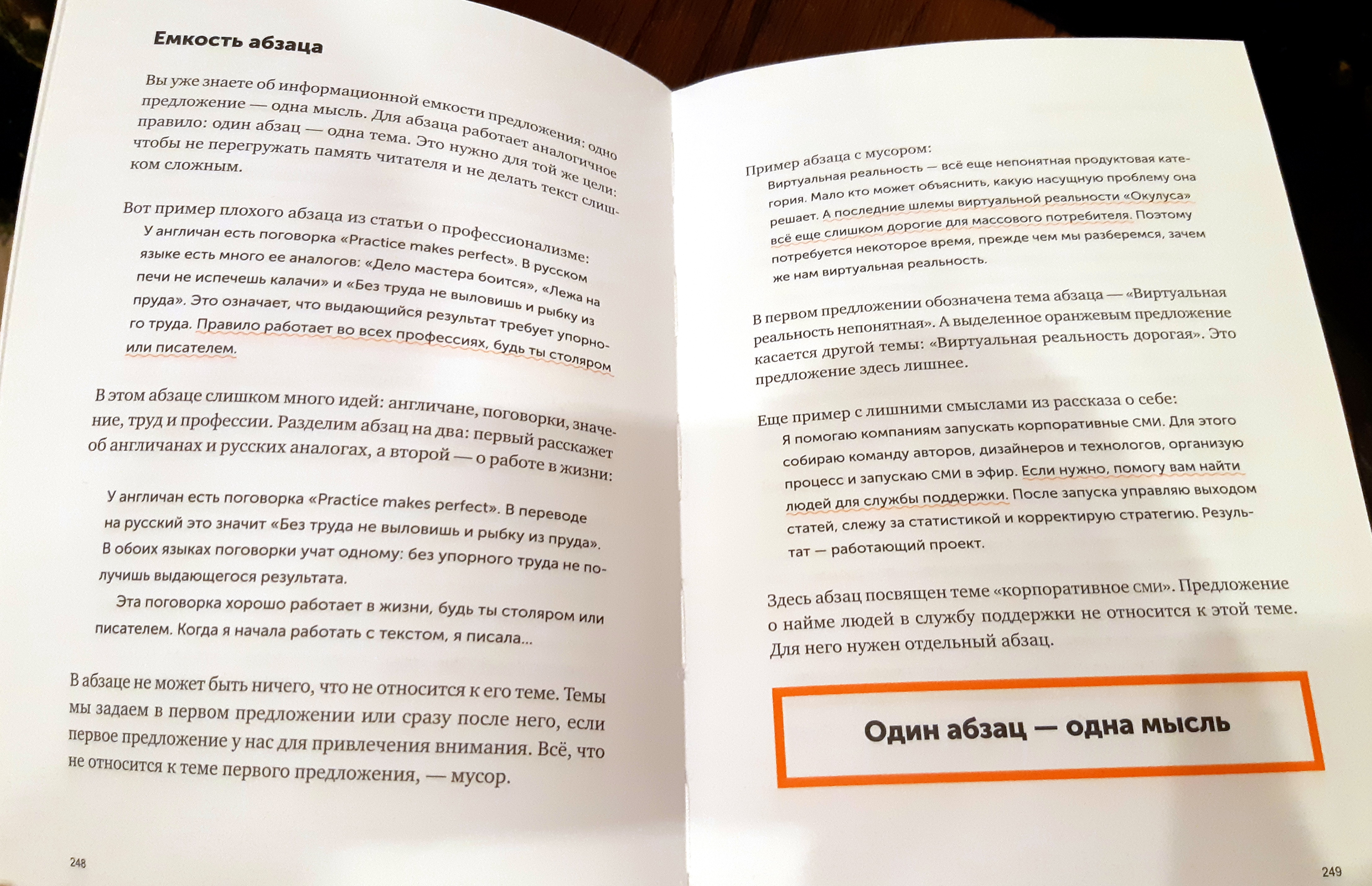 Здесь очень много примеров и держать её как настольную очень даже полезно. Первая часть книги посвящена" очищению" текста от вводных слов и литературных приёмов. Вторая - "донести мысль". Не скажу, конечно, что сухой текст без сторителлинга мне близок. Однако заказчики часто требуют именно коммерческий текст.