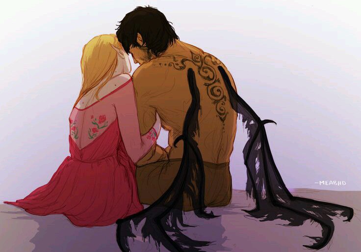 "Night Triumphant and the Stars Eternal. If he was the sweet, terrifying darkness, I was the glittering lights that only his shadows could make clear."В отличие от многих книжных пар, в отношениях Фейры и Рисанда нет ни надуманных ссор,ни глупых истерик.Они построены на глубоком доверии и взаимоуважении. Каждый раз, когда Рис говорил,что Фейра свободна в своих действиях,что он принимает любой её выбор,у меня внутри всё теплело.За какими словами стоит настоящая любовь,если не за этими? Я искренне надеюсь увидеть их счастливое будущее в последующих книгах,потому что они,действительно,заслужили его. Уже мечтаю увидеть великого и непревзойденного Риса, меняющего пеленки своим деткам и убаюкивающего их.