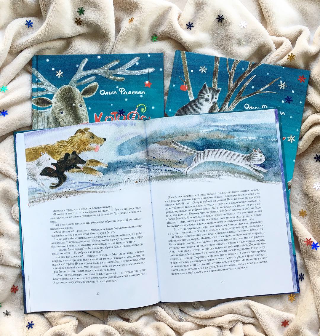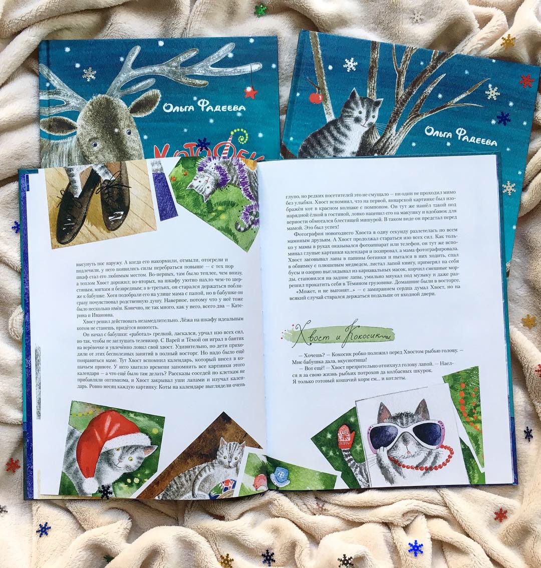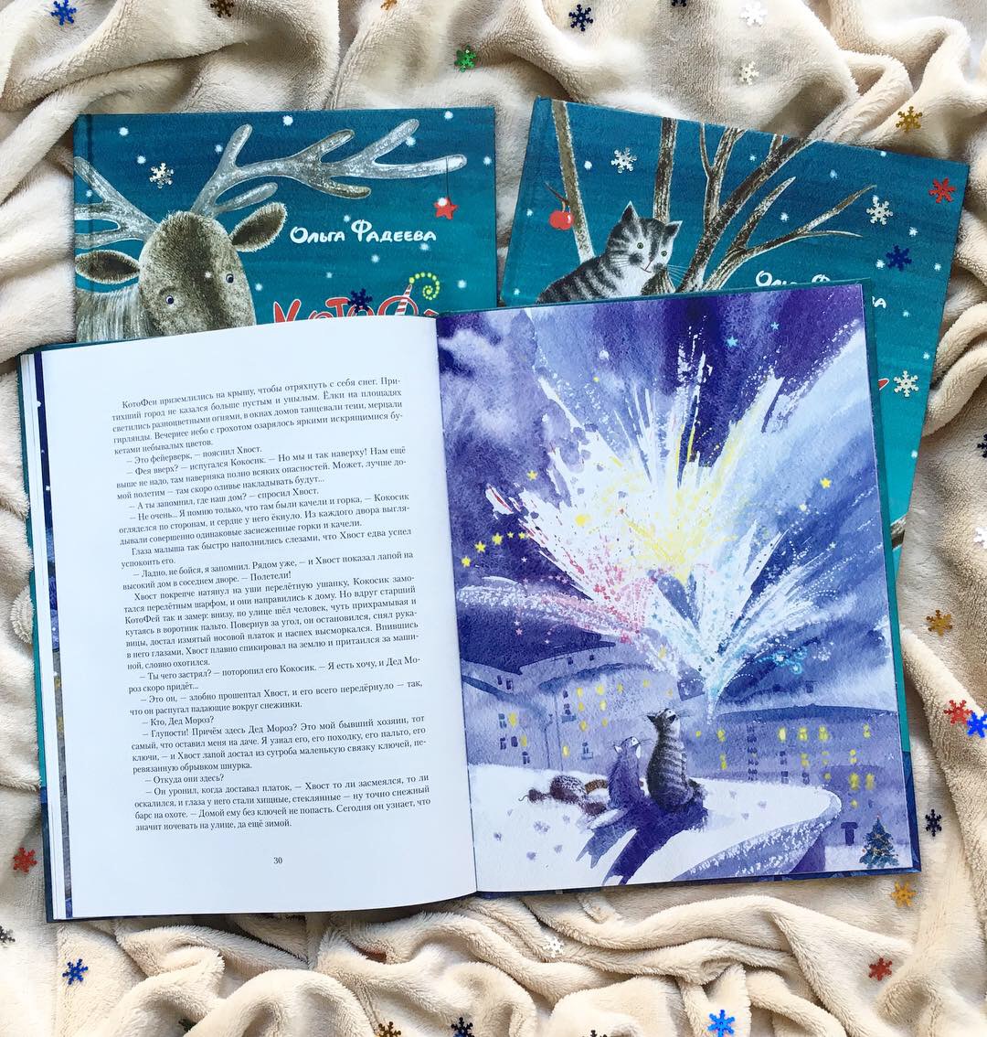 Ольга Фадеева написала чудесные истории про котов и Новый год. Истории, наполненные добротой, домашним уютом, приключениями и волшебством. Книга рассказывает о дружбе, верности, отзывчивости, умении оставлять обиды в прошлом, а ещё о том, что каждый может совершить настоящее чудо (даже если у вас лапки!). Пробуждает (или усиливает) любовь к котикам и кошкам, напоминает, что «мы в ответе за тех, кого приручили» и что нельзя бросать животных на произвол судьбы. Мне кажется, если эту книгу прочитает хотя бы половина населения Земли, всего через несколько лет проблема бездомных животных будет полностью решена.