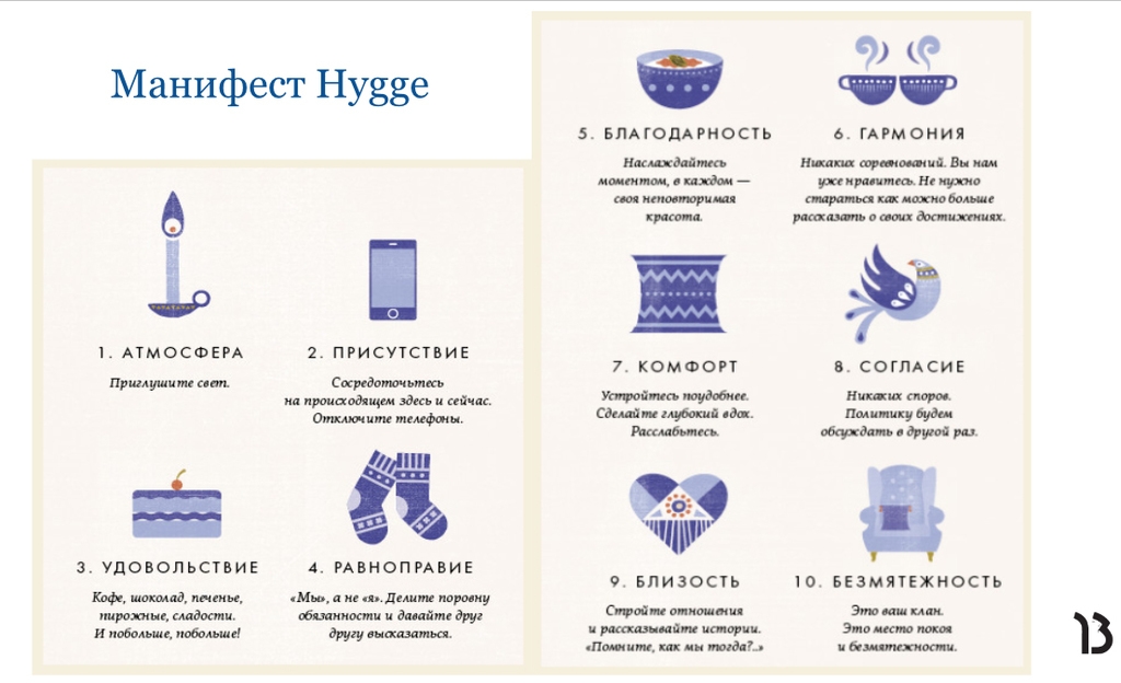 В нашем языке нет аналогов этому слову, и перевести его дословно невозможно. Это понятие само по себе довольно обширное и может означать сразу несколько вещей – как осязаемых, так и совершенно абстрактных. Но если все-таки попытаться объяснить хюггё словами, то на ум сразу приходит следующее: уют, тепло, дружба, спокойствие, счастье. Это у датчан ни много ни мало национальная идея – ощущать душевный и физический комфорт круглый год вопреки ужасным погодным условиям и вообще всему негативному. К слову, именно датчане вот уже несколько лет возглавляют рейтинг стран мира по уровню счастья. И, судя по всему, сдавать позиции они не собираются.
