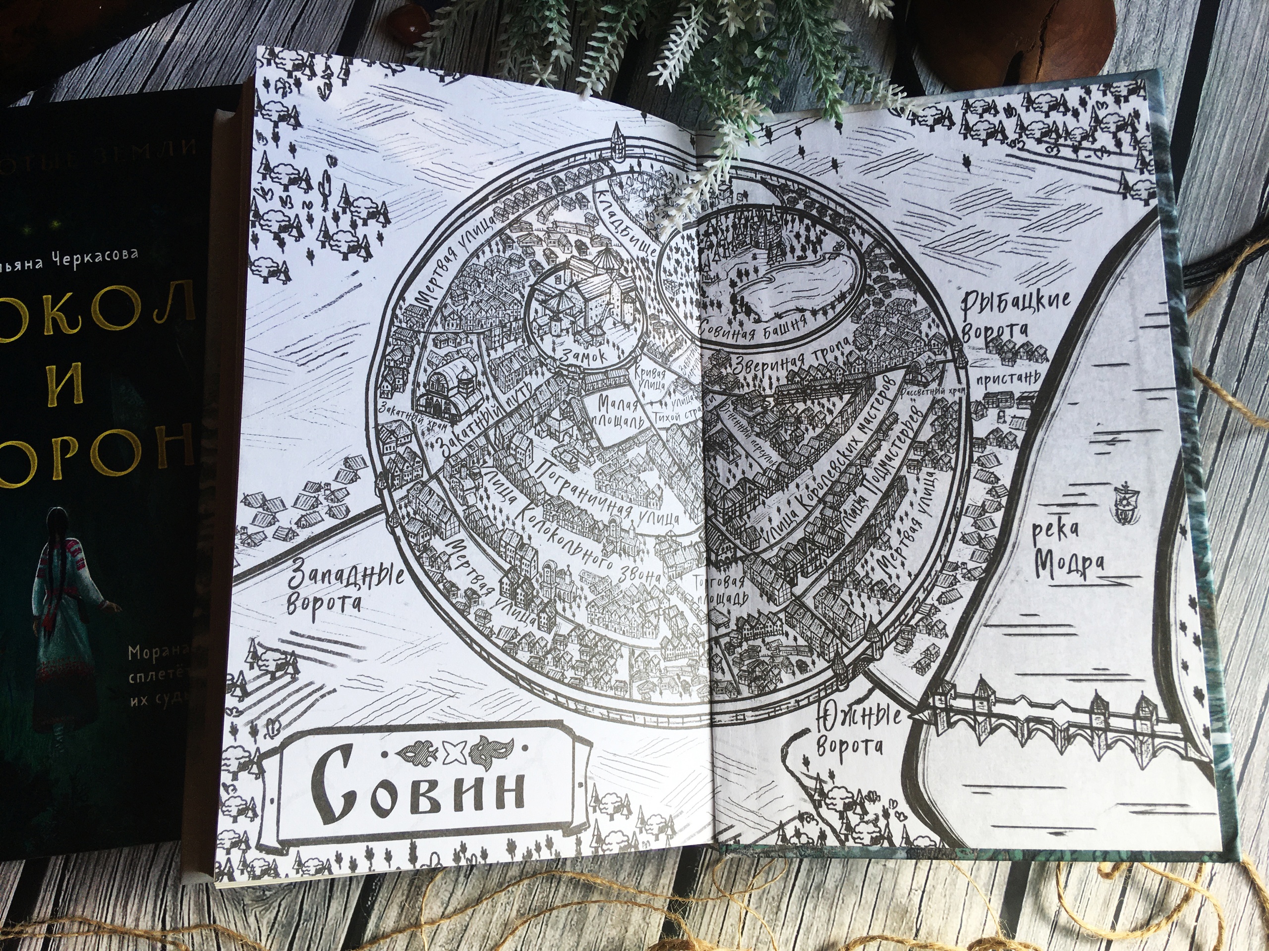 Название книги и сокол над башней залакированы, а название цикла блестит золотой фольгой. На каждой странице у корешка орнамент. Очень красиво, но когда открываю, впечатление немного портит бумага: она тонкая-тонкая, почти газетная.