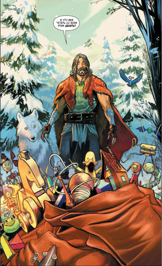 Как-то раз нарубил он заек всяких и прочих пушистых милых зверьков и решил шкурки продать в местном городке. Приехал туда, эля выпил в местном кабаке, а он разбавленный. Огорчился. Следом выяснилось, что местный лорд поехал кукушкой, слышит голос из какого-то камня и одновременно из книги со страшными картинками. Голос тот обещал всякие плюшки и силу за то, чтобы местные работяги добывали уголь в режиме 24/7. Зачем голосам в голове было столько угля в комиксе не поясняется. Одновременно надо было уничтожить радость и не давать всем праздновать Йоль, а у детей отобрать все игрушки, а так же запретить им гулять. Тут уже и пошутить нельзя про трудное детство, скользкий подоконник и деревянные игрушки — все отбирали (насчет подоконника не уверена, но скорее всего и его тоже)) Хотя по виду вокруг настоящее Средневековье, христианство, попы, соборы, но местные почему-то праздновали языческий праздник.