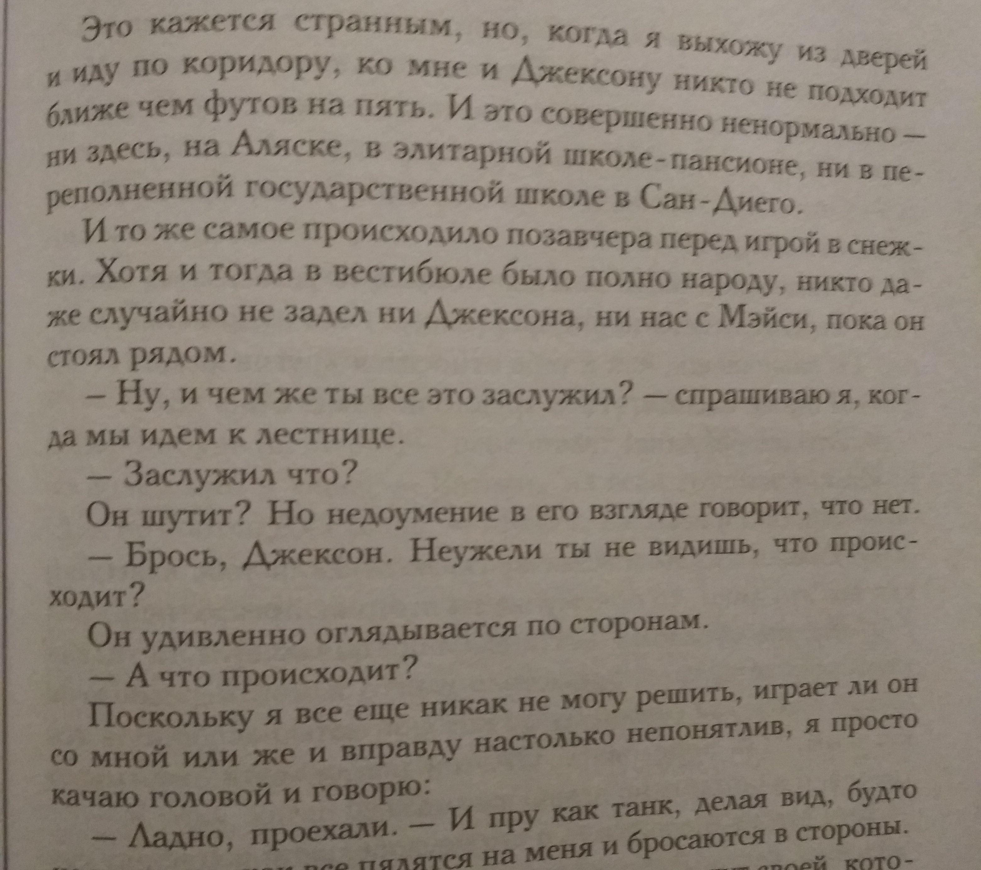 Уже к середине книги я до ужаса устала от постоянного восхищения внешность парней, учитывая, что девушек нам толком и не описали, как и саму ГГ. Неужто в Сан-Диего нет красивых парней?События всей книги (544 страницы) разворачиваются в течении недели. За это время Грейс и Джексон успевают влюбиться друг в друга на всю жизнь. Для неё этот загадочный парень делает вещи, которые для него совершенно несвойственны (это она поняла на второй день знакомства, видев его два раза, по 5 минут каждый). И вот уже милые СМС-очки и прочие слащавые вещи вперемешку с агрессией в сторону прочих воздыхателей Грейс.