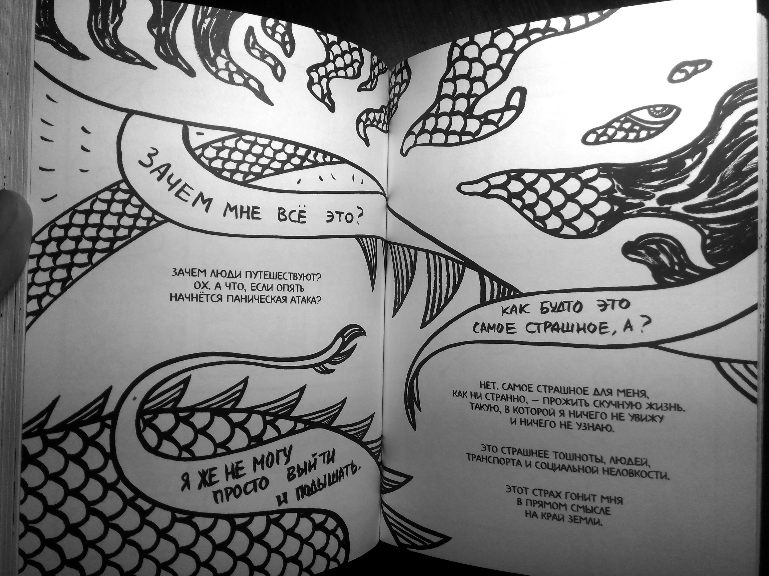 Читать далее«Дневник штормов» Юлии Никитиной — это, действительно, дневник одного путешествия художницы из Салехарда к Карскому морю, исполненный в виде комикса. С первых же страниц Юлия не таясь рассказывает о своей многолетней проблеме — тревожном расстройстве, из-за которого она не может посещать многолюдные места, ездить общественным транспортом и многое другое. И вот с этим грузом и таблетками феназепама она отправляется в давно уже запланированное путешествие.
