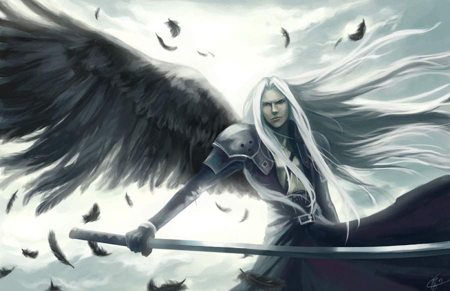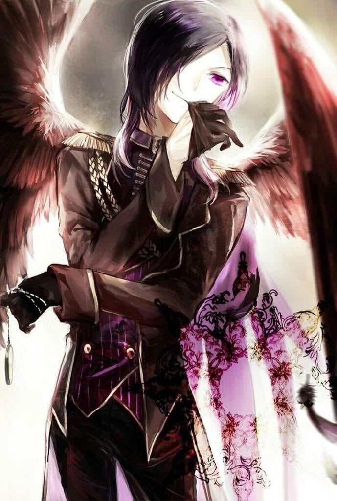 Мы видим прекрасного молодого человека с длинными темными волосами, крыльями и мечом. Выглядит он примерно так: