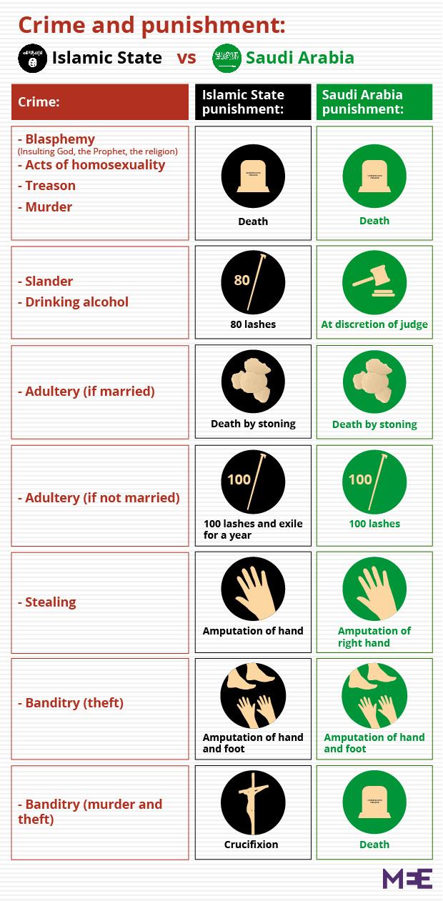 Обратите внимание, что согласно табличке сравнения гомосексуальные акты караются смертью, наравне с изменой, убийством, оскорблениями Пророка и религии. Но при этом у богатых саудитов существуют "мальчики для утех", да и вообще, однополая любовь до свадьбы - это то, на что в Королевстве Саудовская Аравия повсеместно смотрят сквозь пальцы.