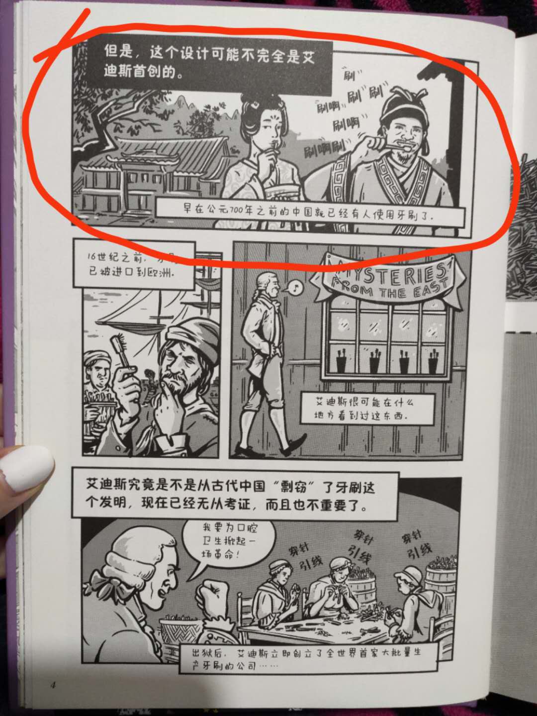 Автор этого комикса американец, обычно, судя по фильмам , американцы любят все заслуги приписывать себе, но дело в том, что комикс переведен на китайский, и мне показалось, что о чем бы не зашла речь все начинают приписывать китайцам. Я не буду спорить о шелке, бумаге, книгопечатании и даже летучем змее. Был странный момент в истории о зубной щетке, комикс внезапно оборвался вставкой, что китайцы еще в 700 году начали пользоваться зубной щеткой, и затем история продолжается, как ни в чем не бывало. Еще один момент в истории про чай, там в скобках было приписано, что чай импортировали в Голландию с Китая. Просто ради любопытства, если у кого-то есть эта книга на русском, либо на других языках, есть-ли там подобные примечания?