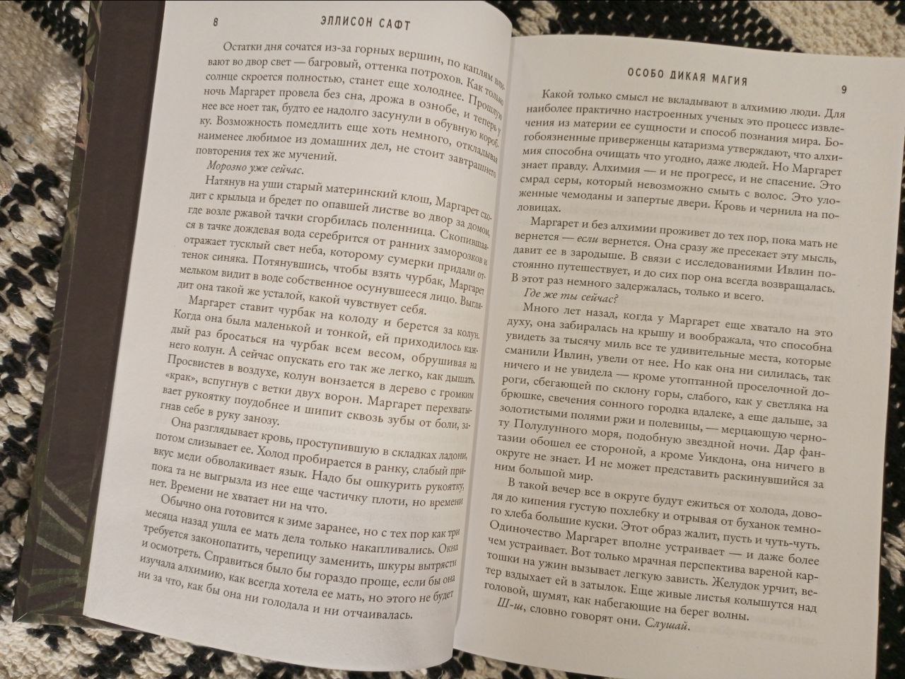 Как, признаться, и весьма специфичный перевод, который вроде бы и неграмотным в прямом смысле этого слова не назовешь, но вечно хочется поправить что-то тут и там: словечко изменить, фразу перестроить и еще всякое по мелочи, но буквально постоянно, так что я слегка вымоталась и могла потреблять текст лишь скупыми порциями, отчего и провозилась с книгой дольше, чем планировала (а еще там всё в настоящем времени, хотя это и не самое страшное).Не будь этих двух претензий я бы, пожалуй, оценила "Особо дикую магию" и выше - настолько мне понравились медленные брожения двух сломленных прошлым и связанных ответственностью перед семьей людей, которые, несмотря ни на что, умудряются найти опору в ком-то и чем-то еще, кроме своей боли и привычных родственных связей.