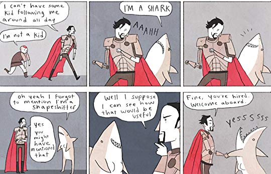 В этом графическом романе прекрасно абсолютно все, начиная с эпиграфа "to all monster girls", истории, локаций и заканчивая невероятными персонажами.Nimona, девочка-подросток со способностью превращаться в любое живое существо. Вот серьезно. В любое. И здесь этих превращений будет немало. Она веселая, бесшабашная, загадочная и одинокая. Ее бесшабашность - причина, почему она нанимается "на работу" к Главному Злодею Королевства.